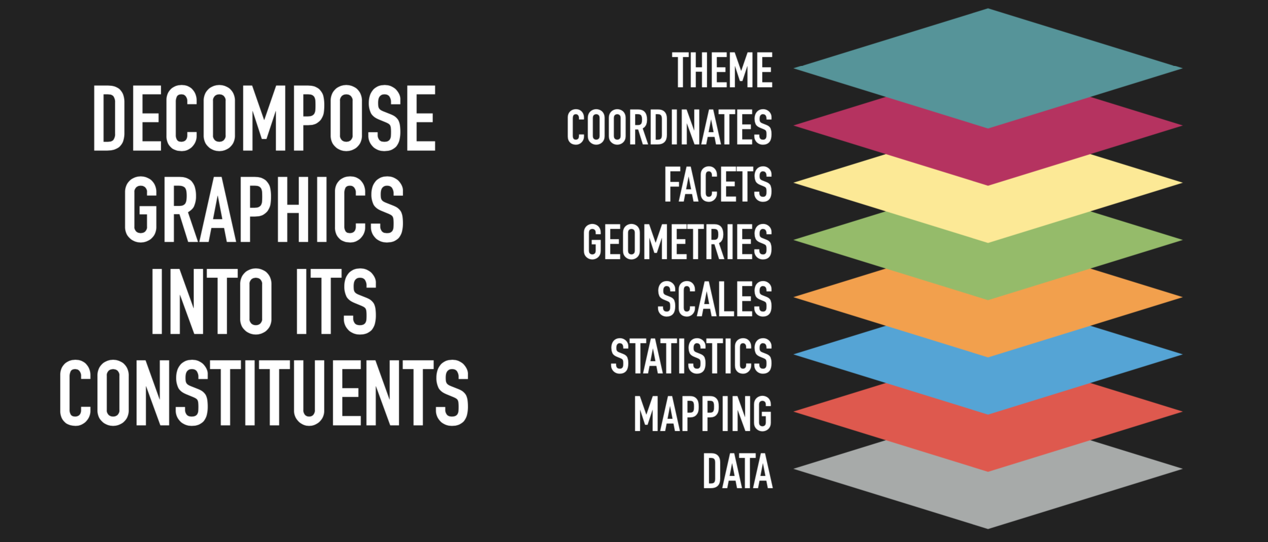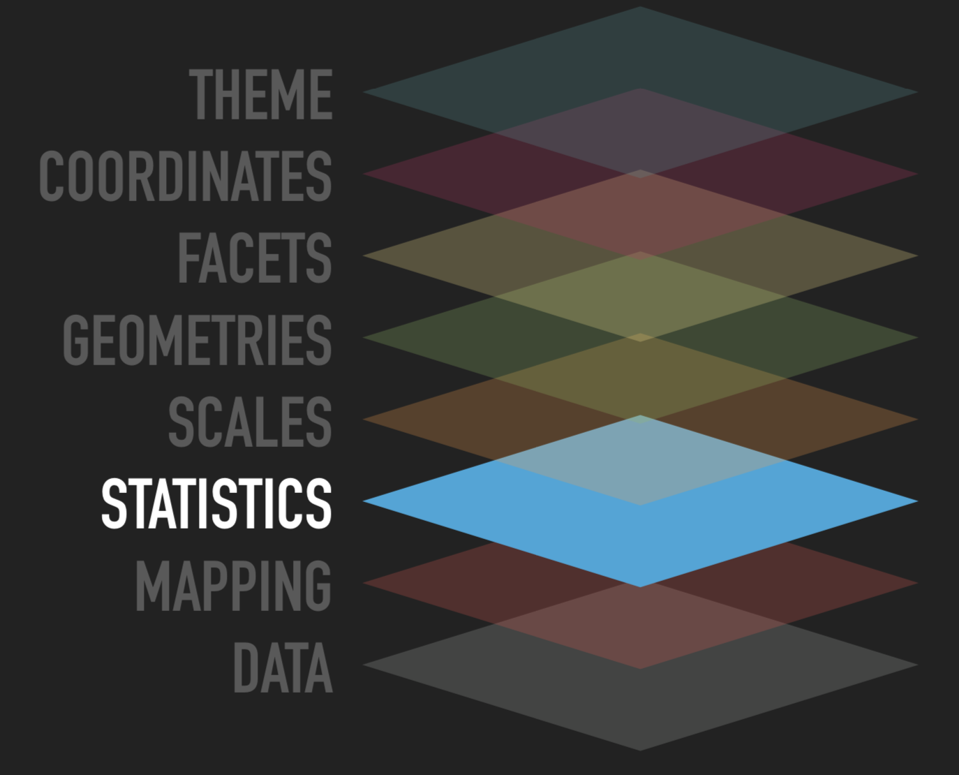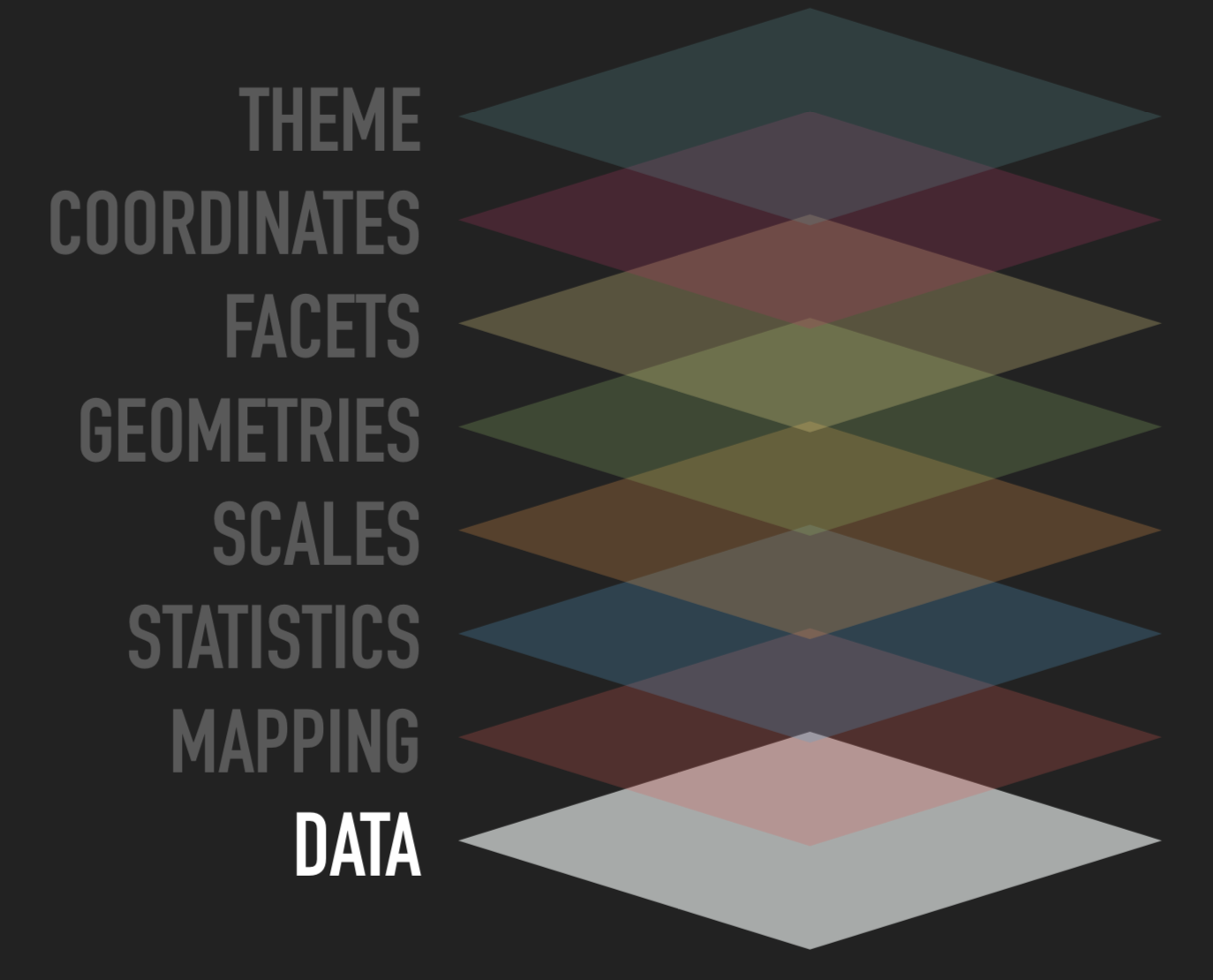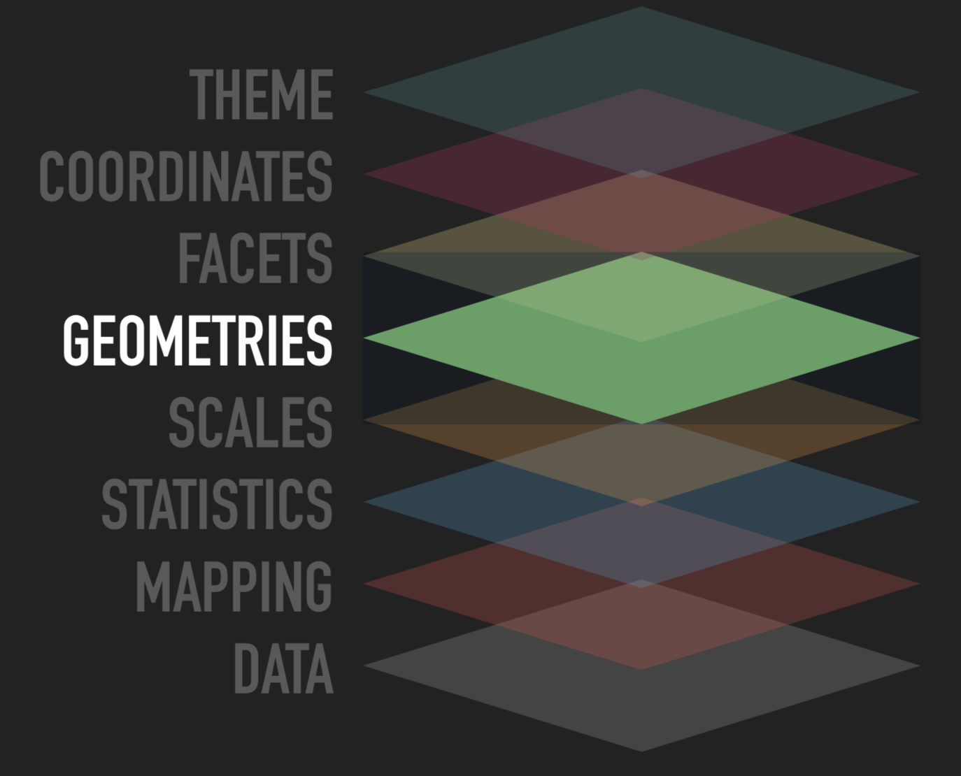 : [https://statisticalinference.netlify.app](https://statisticalinference.netlify.app) 😄 ] --- # **Agenda** - Introduction to the Grammar of Graphics - We will be looking at the different layers that is in ggplot2 - The focus of this talk will be on the 20% that is useful 80% of the time - More in-depth coverage is available via resources I will release later. - **My goal is to make you excited about ggplot2!** - I will entertain **questions** at the end - **Github link to get the materials**: https://github.com/BB1464/R-Ladies-Abuja --- # Packages Used Today This workshop focuses on data visualization with [`ggplot2`](https://ggplot2.tidyverse.org). -- `ggplot2` is a system for declaratively creating graphics, based on The Grammar of Graphics. You provide the data, tell `ggplot2` how to map variables to `aesthetics`, what graphical primitives to use (`geoms`), and it takes care of the details. -- You can install `ggplot2` with the following: ```r install.packages("ggplot2") ``` Or the development version from GitHub: ```r install.packages("devtools") ``` ```r devtools::install_github("tidyverse/ggplot2") ``` ```r library(ggplot2) # Create Elegant Data Visualizations Using the Grammar of Graphics, CRAN v3.3.5 ``` --- # Grammar of Graphics .pull-right[] .pull-left[ - First published in 1999 - A theoretical deconstruction of data graphics - Foundation for many graphic applications - The Grammar of Graphics can be applied to every type of plot - Concisely describe components .pull-left[] ] --- # Grammar of Graphics  --- # Grammar of Graphics .pull-right[] - Your dataset - Tidy format - There is no visualization without a dataset --- # Grammar of Graphics .pull-right[] - **Aesthetics mapping**: links variable in the data to graphical properties in the geometry. - We can specify the following properties within the aestetic mapping (colour, shape, alpha, fill, size). --- # Grammar of Graphics .pull-right[] - Transform input variables to displayed values: - Bins for histogram - Summary statistics for boxplot using `stat_boxplot()` - No. of observations in a category for bar chart `stat_count` - Even tidy data may need some transformation - The statistics is linked to the geometry - It is implicit in many plot-types but they can be done prior to plotting. --- # Grammar of Graphics .pull-right[] - Scales help us to control the mapping from data to aesthetics - Scales also provide the tools that let you interpret the plot: the axes and legends. - Scales are automatically generated in ggplot and can be customized - log scale - We can also specify limit within the scale - Scales help you interpret the plot - Categories -> color - Numeric -> position --- # Grammar of Graphics .pull-right[] - Geometries help us to interpret the aesthetics as graphical representation - Determines your plot type - bar chart `geom_bar()` - scatter `geom_point()` - box plot `geom_boxplot()` - histogram `geom_histogram()` - ... --- # Grammar of Graphics .pull-right[] - Divide your data into panels using one or two groups - Allows you to look at smaller subsets of data --- # Grammar of Graphics .pull-right[] - A coordinate system, maps the position of objects onto the plane of the plot. - It is also the physical mapping of the aesthetics to the paper - Coordinate systems affect all position variables simultaneously and differ from scales in that they also change the appearance of the geometric objects. - Coordinate systems control how the axes and grid lines are drawn. --- # Grammar of Graphics .pull-right[] - This controls the overall look of the plot - Spans every part of the graphic that is not linked to the data - Themes give you control over things like fonts, ticks, panel strips, and backgrounds ---  --- - `The Data Layer` specifies the data being plotted .center[  ] ```r head(iris,2) ``` ``` ## Sepal.Length Sepal.Width Petal.Length Petal.Width Species ## 1 5.1 3.5 1.4 0.2 setosa ## 2 4.9 3.0 1.4 0.2 setosa ``` ```r ggplot(data = iris) ``` <img src="index_files/figure-html/unnamed-chunk-5-1.png" style="display: block; margin: auto;" /> --- - Aesthetic mapping ```r ggplot(data = iris, mapping = aes( x = Sepal.Length, y = Sepal.Width, colour=Species,shape=Species), alpha=0.5 ) ``` <img src="index_files/figure-html/unnamed-chunk-6-1.png" style="display: block; margin: auto;" /> --- # Geoms `ggplot2` has 53 `geometry` at the moments but we are going to look at just few `geometry` today. But I will release some useful resources at the end where you can learn further on what is not covered here. - We can view all the geoms with this function below ```r apropos('^geom_') ``` ``` ## [1] "geom_abline" "geom_area" "geom_bar" ## [4] "geom_bin_2d" "geom_bin2d" "geom_blank" ## [7] "geom_boxplot" "geom_col" "geom_contour" ## [10] "geom_contour_filled" "geom_count" "geom_crossbar" ## [13] "geom_curve" "geom_density" "geom_density_2d" ## [16] "geom_density_2d_filled" "geom_density2d" "geom_density2d_filled" ## [19] "geom_dotplot" "geom_errorbar" "geom_errorbarh" ## [22] "geom_freqpoly" "geom_function" "geom_hex" ## [25] "geom_histogram" "geom_hline" "geom_jitter" ## [28] "geom_label" "geom_line" "geom_linerange" ## [31] "geom_map" "geom_path" "geom_point" ## [34] "geom_pointrange" "geom_polygon" "geom_qq" ## [37] "geom_qq_line" "geom_quantile" "geom_raster" ## [40] "geom_rect" "geom_ribbon" "geom_rug" ## [43] "geom_segment" "geom_sf" "geom_sf_label" ## [46] "geom_sf_text" "geom_smooth" "geom_spoke" ## [49] "geom_step" "geom_text" "geom_tile" ## [52] "geom_violin" "geom_vline" ``` --- # Scatter plot ```r ggplot(data = iris, mapping = aes( x = Sepal.Length, y = Sepal.Width, colour=Species,shape=Species), alpha=0.5 )+ geom_point() ``` <img src="index_files/figure-html/unnamed-chunk-8-1.png" style="display: block; margin: auto;" /> --- - Variable that is not link to the data set ```r ggplot(data = iris, mapping = aes( x = Sepal.Length, y = Sepal.Width,shape=Species,colour='blue'))+ geom_point() ``` <img src="index_files/figure-html/un