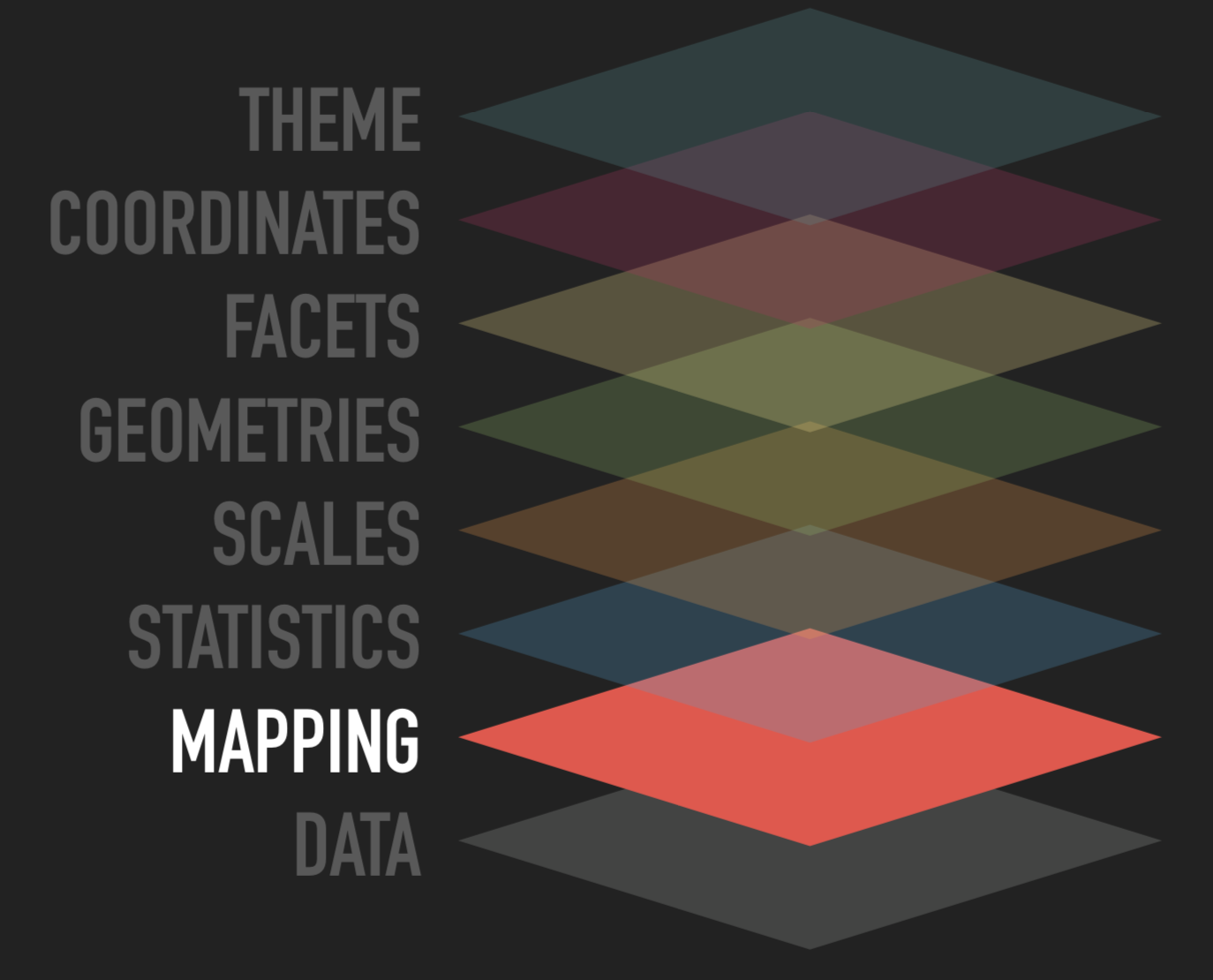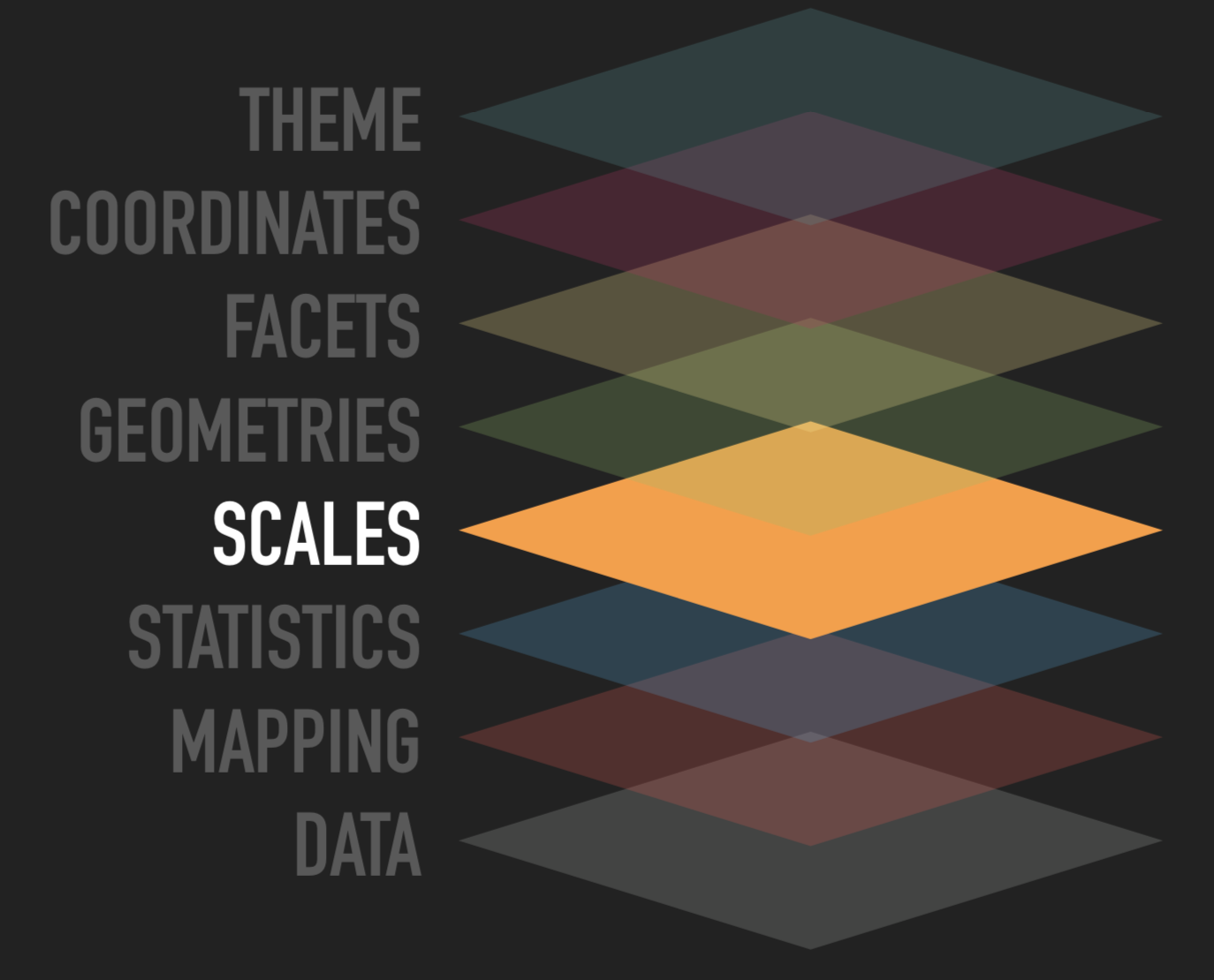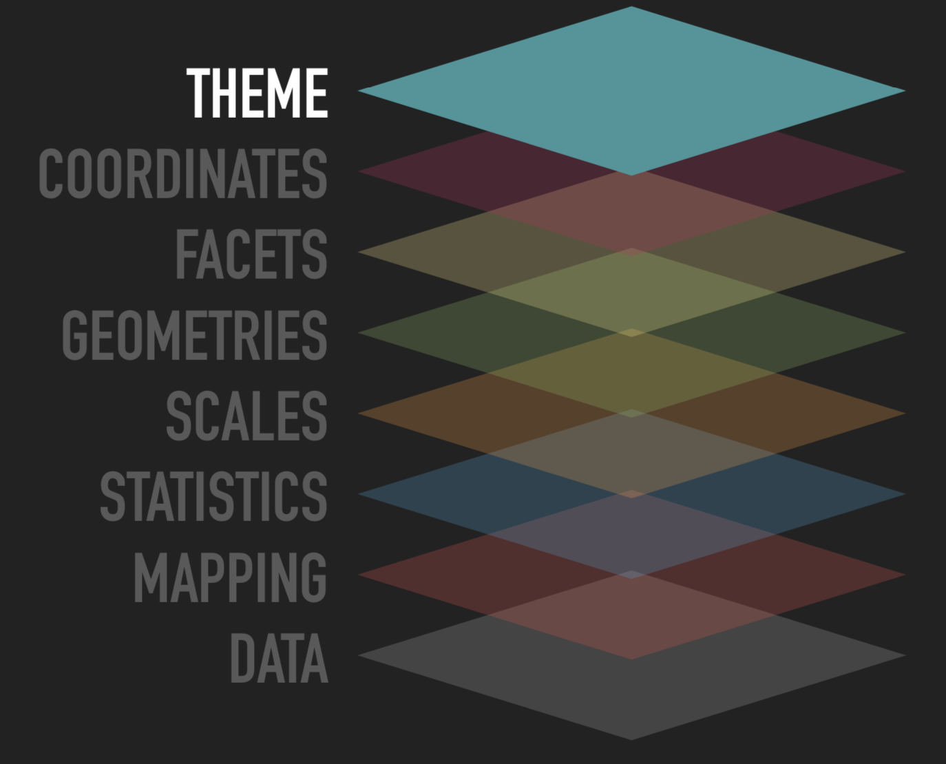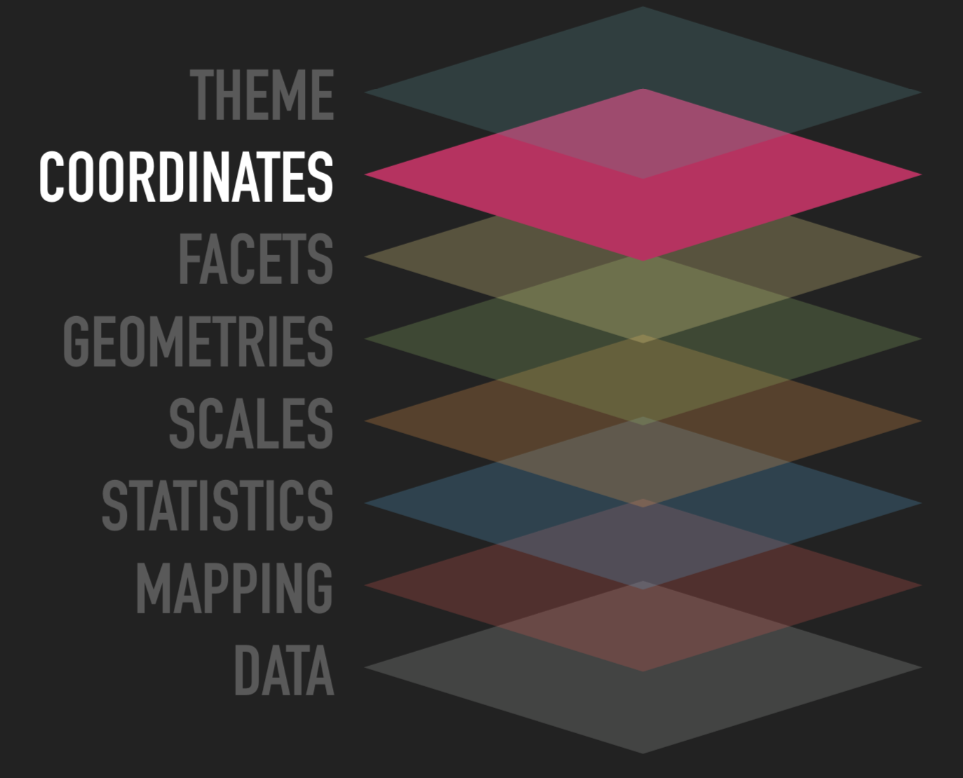 : [https://statisticalinference.netlify.app](https://statisticalinference.netlify.app) 😄 ] --- # **Agenda** - Introduction to the Grammar of Graphics - We will be looking at the different layers that is in ggplot2 - The focus of this talk will be on the 20% that is useful 80% of the time - More in-depth coverage is available via resources I will release later. - **My goal is to make you excited about ggplot2!** - I will entertain **questions** at the end - **Github link to get the materials**: https://github.com/BB1464/R-Ladies-Abuja --- # Packages Used Today This workshop focuses on data visualization with [`ggplot2`](https://ggplot2.tidyverse.org). -- `ggplot2` is a system for declaratively creating graphics, based on The Grammar of Graphics. You provide the data, tell `ggplot2` how to map variables to `aesthetics`, what graphical primitives to use (`geoms`), and it takes care of the details. -- You can install `ggplot2` with the following: ```r install.packages("ggplot2") ``` Or the development version from GitHub: ```r install.packages("devtools") ``` ```r devtools::install_github("tidyverse/ggplot2") ``` ```r library(ggplot2) # Create Elegant Data Visualizations Using the Grammar of Graphics, CRAN v3.3.5 ``` --- # Grammar of Graphics .pull-right[] .pull-left[ - First published in 1999 - A theoretical deconstruction of data graphics - Foundation for many graphic applications - The Grammar of Graphics can be applied to every type of plot - Concisely describe components .pull-left[] ] --- # Grammar of Graphics  --- # Grammar of Graphics .pull-right[] - Your dataset - Tidy format - There is no visualization without a dataset --- # Grammar of Graphics .pull-right[] - **Aesthetics mapping**: links variable in the data to graphical properties in the geometry. - We can specify the following properties within the aestetic mapping (colour, shape, alpha, fill, size). --- # Grammar of Graphics .pull-right[] - Transform input variables to displayed values: - Bins for histogram - Summary statistics for boxplot using `stat_boxplot()` - No. of observations in a category for bar chart `stat_count` - Even tidy data may need some transformation - The statistics is linked to the geometry - It is implicit in many plot-types but they can be done prior to plotting. --- # Grammar of Graphics .pull-right[] - Scales help us to control the mapping from data to aesthetics - Scales also provide the tools that let you interpret the plot: the axes and legends. - Scales are automatically generated in ggplot and can be customized - log scale - We can also specify limit within the scale - Scales help you interpret the plot - Categories -> color - Numeric -> position --- # Grammar of Graphics .pull-right[] - Geometries help us to interpret the aesthetics as graphical representation - Determines your plot type - bar chart `geom_bar()` - scatter `geom_point()` - box plot `geom_boxplot()` - histogram `geom_histogram()` - ... --- # Grammar of Graphics .pull-right[] - Divide your data into panels using one or two groups - Allows you to look at smaller subsets of data --- # Grammar of Graphics .pull-right[] - A coordinate system, maps the position of objects onto the plane of the plot. - It is also the physical mapping of the aesthetics to the paper - Coordinate systems affect all position variables simultaneously and differ from scales in that they also change the appearance of the geometric objects. - Coordinate systems control how the axes and grid lines are drawn. --- # Grammar of Graphics .pull-right[] - This controls the overall look of the plot - Spans every part of the graphic that is not linked to the data - Themes give you control over things like fonts, ticks, panel strips, and backgrounds ---  --- - `The Data Layer` specifies the data being plotted .center[  ] ```r head(iris,2) ``` ``` ## Sepal.Length Sepal.Width Petal.Length Petal.Width Species ## 1 5.1 3.5 1.4 0.2 setosa ## 2 4.9 3.0 1.4 0.2 setosa ``` ```r ggplot(data = iris) ``` <img src="index_files/figure-html/unnamed-chunk-5-1.png" style="display: block; margin: auto;" /> --- - Aesthetic mapping ```r ggplot(data = iris, mapping = aes( x = Sepal.Length, y = Sepal.Width, colour=Species,shape=Species), alpha=0.5 ) ``` <img src="index_files/figure-html/unnamed-chunk-6-1.png" style="display: block; margin: auto;" /> --- # Geoms `ggplot2` has 53 `geometry` at the moments but we are going to look at just few `geometry` today. But I will release some useful resources at the end where you can learn further on what is not covered here. - We can view all the geoms with this function below ```r apropos('^geom_') ``` ``` ## [1] "geom_abline" "geom_area" "geom_bar" ## [4] "geom_bin_2d" "geom_bin2d" "geom_blank" ## [7] "geom_boxplot" "geom_col" "geom_contour" ## [10] "geom_contour_filled" "geom_count" "geom_crossbar" ## [13] "geom_curve" "geom_density" "geom_density_2d" ## [16] "geom_density_2d_filled" "geom_density2d" "geom_density2d_filled" ## [19] "geom_dotplot" "geom_errorbar" "geom_errorbarh" ## [22] "geom_freqpoly" "geom_function" "geom_hex" ## [25] "geom_histogram" "geom_hline" "geom_jitter" ## [28] "geom_label" "geom_line" "geom_linerange" ## [31] "geom_map" "geom_path" "geom_point" ## [34] "geom_pointrange" "geom_polygon" "geom_qq" ## [37] "geom_qq_line" "geom_quantile" "geom_raster" ## [40] "geom_rect" "geom_ribbon" "geom_rug" ## [43] "geom_segment" "geom_sf" "geom_sf_label" ## [46] "geom_sf_text" "geom_smooth" "geom_spoke" ## [49] "geom_step" "geom_text" "geom_tile" ## [52] "geom_violin" "geom_vline" ``` --- # Scatter plot ```r ggplot(data = iris, mapping = aes( x = Sepal.Length, y = Sepal.Width, colour=Species,shape=Species), alpha=0.5 )+ geom_point() ``` <img src="index_files/figure-html/unnamed-chunk-8-1.png" style="display: block; margin: auto;" /> --- - Variable that is not link to the data set ```r ggplot(data = iris, mapping = aes( x = Sepal.Length, y = Sepal.Width,shape=Species,colour='blue'))+ geom_point() ``` <img src="index_files/figure-html/un