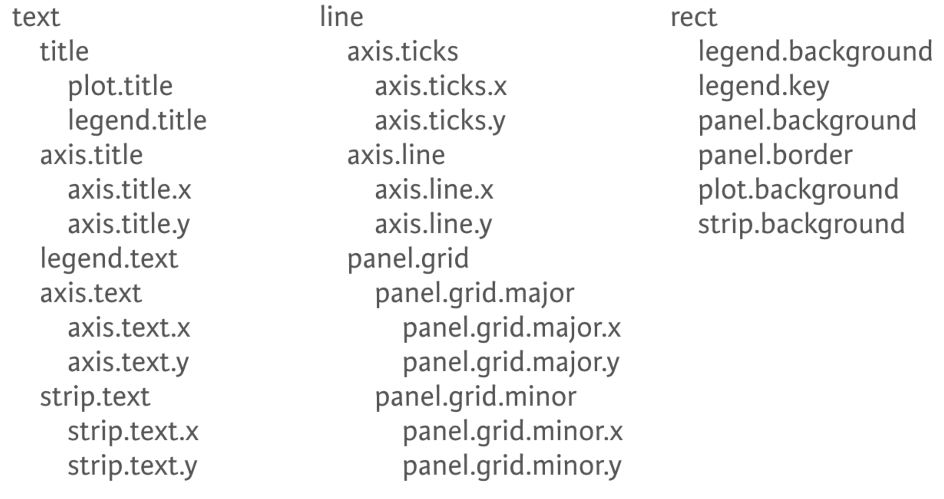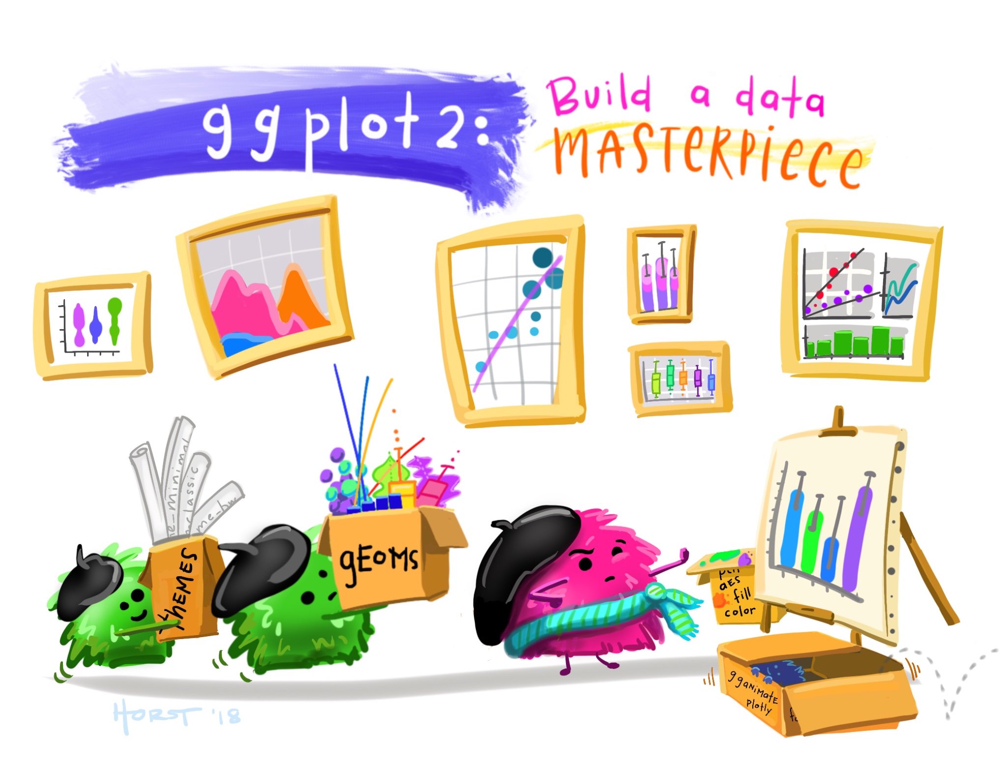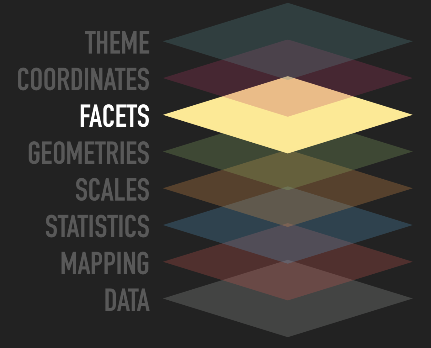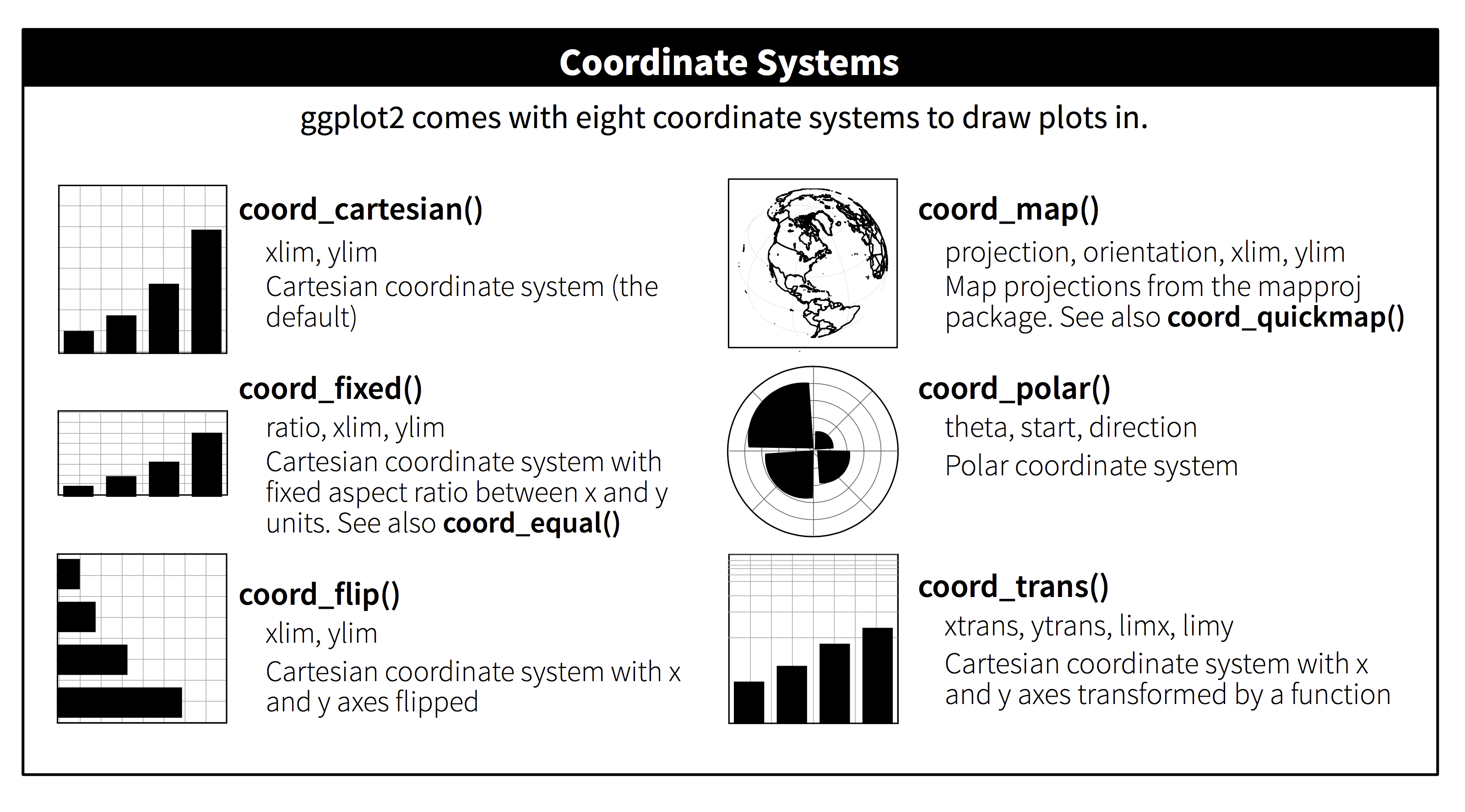 : [https://statisticalinference.netlify.app](https://statisticalinference.netlify.app) 😄 ] --- # **Agenda** - Introduction to the Grammar of Graphics - We will be looking at the different layers that is in ggplot2 - The focus of this talk will be on the 20% that is useful 80% of the time - More in-depth coverage is available via resources I will release later. - **My goal is to make you excited about ggplot2!** - I will entertain **questions** at the end - **Github link to get the materials**: https://github.com/BB1464/R-Ladies-Abuja --- # Packages Used Today This workshop focuses on data visualization with [`ggplot2`](https://ggplot2.tidyverse.org). -- `ggplot2` is a system for declaratively creating graphics, based on The Grammar of Graphics. You provide the data, tell `ggplot2` how to map variables to `aesthetics`, what graphical primitives to use (`geoms`), and it takes care of the details. -- You can install `ggplot2` with the following: ```r install.packages("ggplot2") ``` Or the development version from GitHub: ```r install.packages("devtools") ``` ```r devtools::install_github("tidyverse/ggplot2") ``` ```r library(ggplot2) # Create Elegant Data Visualizations Using the Grammar of Graphics, CRAN v3.3.5 ``` --- # Grammar of Graphics .pull-right[] .pull-left[ - First published in 1999 - A theoretical deconstruction of data graphics - Foundation for many graphic applications - The Grammar of Graphics can be applied to every type of plot - Concisely describe components .pull-left[] ] --- # Grammar of Graphics  --- # Grammar of Graphics .pull-right[] - Your dataset - Tidy format - There is no visualization without a dataset --- # Grammar of Graphics .pull-right[] - **Aesthetics mapping**: links variable in the data to graphical properties in the geometry. - We can specify the following properties within the aestetic mapping (colour, shape, alpha, fill, size). --- # Grammar of Graphics .pull-right[] - Transform input variables to displayed values: - Bins for histogram - Summary statistics for boxplot using `stat_boxplot()` - No. of observations in a category for bar chart `stat_count` - Even tidy data may need some transformation - The statistics is linked to the geometry - It is implicit in many plot-types but they can be done prior to plotting. --- # Grammar of Graphics .pull-right[] - Scales help us to control the mapping from data to aesthetics - Scales also provide the tools that let you interpret the plot: the axes and legends. - Scales are automatically generated in ggplot and can be customized - log scale - We can also specify limit within the scale - Scales help you interpret the plot - Categories -> color - Numeric -> position --- # Grammar of Graphics .pull-right[] - Geometries help us to interpret the aesthetics as graphical representation - Determines your plot type - bar chart `geom_bar()` - scatter `geom_point()` - box plot `geom_boxplot()` - histogram `geom_histogram()` - ... --- # Grammar of Graphics .pull-right[] - Divide your data into panels using one or two groups - Allows you to look at smaller subsets of data --- # Grammar of Graphics .pull-right[] - A coordinate system, maps the position of objects onto the plane of the plot. - It is also the physical mapping of the aesthetics to the paper - Coordinate systems affect all position variables simultaneously and differ from scales in that they also change the appearance of the geometric objects. - Coordinate systems control how the axes and grid lines are drawn. --- # Grammar of Graphics .pull-right[] - This controls the overall look of the plot - Spans every part of the graphic that is not linked to the data - Themes give you control over things like fonts, ticks, panel strips, and backgrounds ---  --- - `The Data Layer` specifies the data being plotted .center[  ] ```r head(iris,2) ``` ``` ## Sepal.Length Sepal.Width Petal.Length Petal.Width Species ## 1 5.1 3.5 1.4 0.2 setosa ## 2 4.9 3.0 1.4 0.2 setosa ``` ```r ggplot(data = iris) ``` <img src="index_files/figure-html/unnamed-chunk-5-1.png" style="display: block; margin: auto;" /> --- - Aesthetic mapping ```r ggplot(data = iris, mapping = aes( x = Sepal.Length, y = Sepal.Width, colour=Species,shape=Species), alpha=0.5 ) ``` <img src="index_files/figure-html/unnamed-chunk-6-1.png" style="display: block; margin: auto;" /> --- # Geoms `ggplot2` has 53 `geometry` at the moments but we are going to look at just few `geometry` today. But I will release some useful resources at the end where you can learn further on what is not covered here. - We can view all the geoms with this function below ```r apropos('^geom_') ``` ``` ## [1] "geom_abline" "geom_area" "geom_bar" ## [4] "geom_bin_2d" "geom_bin2d" "geom_blank" ## [7] "geom_boxplot" "geom_col" "geom_contour" ## [10] "geom_contour_filled" "geom_count" "geom_crossbar" ## [13] "geom_curve" "geom_density" "geom_density_2d" ## [16] "geom_density_2d_filled" "geom_density2d" "geom_density2d_filled" ## [19] "geom_dotplot" "geom_errorbar" "geom_errorbarh" ## [22] "geom_freqpoly" "geom_function" "geom_hex" ## [25] "geom_histogram" "geom_hline" "geom_jitter" ## [28] "geom_label" "geom_line" "geom_linerange" ## [31] "geom_map" "geom_path" "geom_point" ## [34] "geom_pointrange" "geom_polygon" "geom_qq" ## [37] "geom_qq_line" "geom_quantile" "geom_raster" ## [40] "geom_rect" "geom_ribbon" "geom_rug" ## [43] "geom_segment" "geom_sf" "geom_sf_label" ## [46] "geom_sf_text" "geom_smooth" "geom_spoke" ## [49] "geom_step" "geom_text" "geom_tile" ## [52] "geom_violin" "geom_vline" ``` --- # Scatter plot ```r ggplot(data = iris, mapping = aes( x = Sepal.Length, y = Sepal.Width, colour=Species,shape=Species), alpha=0.5 )+ geom_point() ``` <img src="index_files/figure-html/unnamed-chunk-8-1.png" style="display: block; margin: auto;" /> --- - Variable that is not link to the data set ```r ggplot(data = iris, mapping = aes( x = Sepal.Length, y = Sepal.Width,shape=Species,colour='blue'))+ geom_point() ``` <img src="index_files/figure-html/un